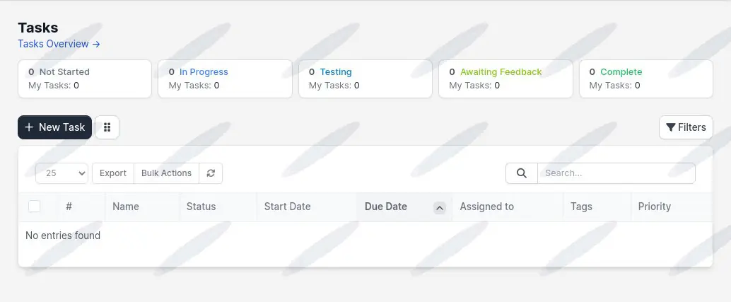 The Tasks module offers a comprehensive task management system, allowing users to create, assign, and track tasks through various stages (Not Started, In Progress, Testing, Awaiting Feedback, Complete). It supports efficient workflow management and team collaboration.