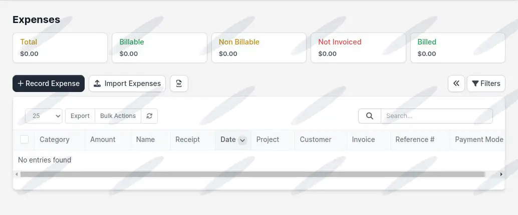 Track and manage all business expenditures with the Expenses module. It categorizes expenses as total, billable, non-billable, not invoiced, and billed, providing a detailed financial record for better budgeting and financial control.